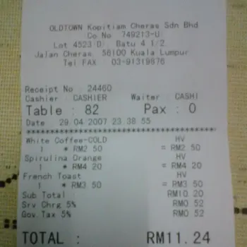 Old Town White Coffee, French Toast, Spirulina Orange, White Coffee, "Teh Si", Ximut Milk Tea, Ham Cheese Polo Bun